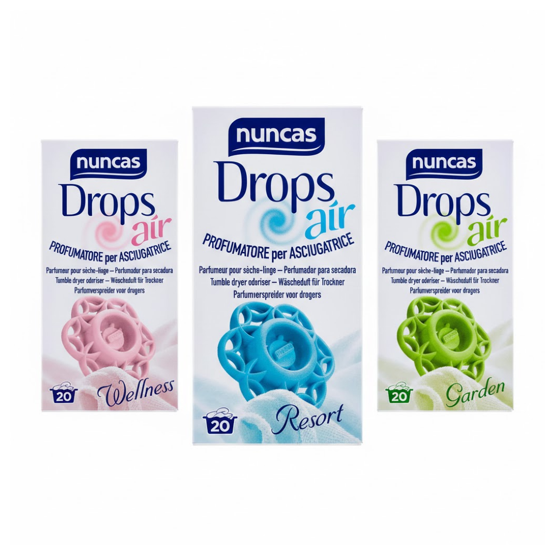 Spezieller Parfümierer für Trockner, parfümiert Ihre Wäsche, indem er den unangenehmen Feuchtigkeitsgeruch beseitigt. Seine einzigartige und patentierte Form wurde speziell entwickelt, um den Duft allmählich und gleichmäßig an die Kleidungsstücke abzugeben. Drops Air ist speziell für Wärmepumpentrockner geeignet, da sie 100 °C nicht überschreiten. Erhältlich in 3 raffinierten Nuncas-Auswahldüften.