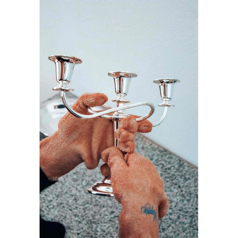 I guanti permettono di tenere saldamente l'oggetto in mano durante la pulizia e le mani restano asciutte. La pulizia è facile, dà risultati istantanei e non lascia micro-graffi o segni sul metallo. Gli oggetti d'argento e metallo argentato ritornano puliti e brillanti.