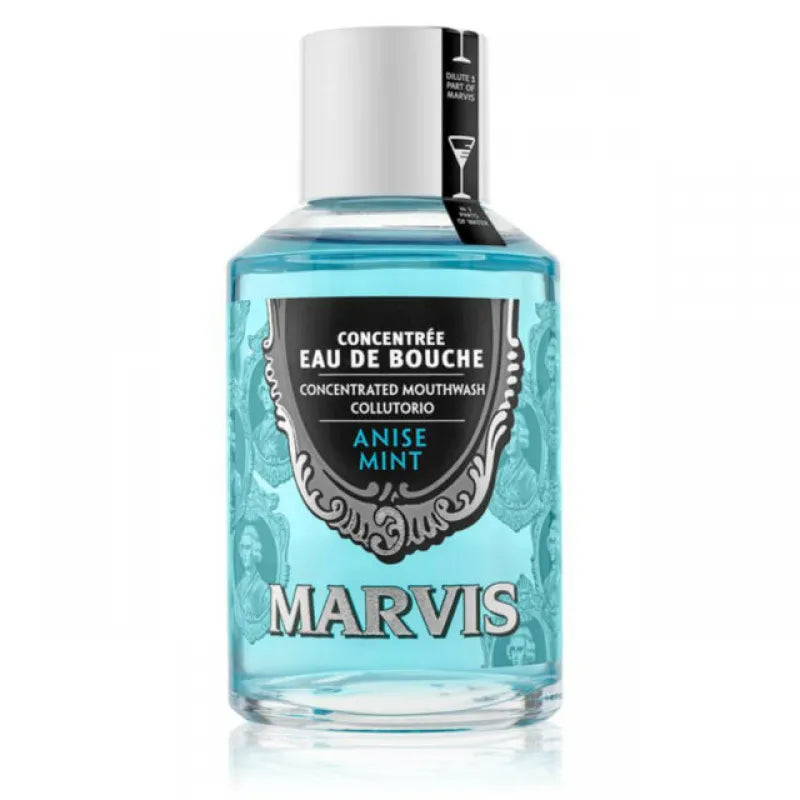 Marvis Anise mint collutorio concentrato avvolge la bocca con una fresca e frizzante sensazione di menta e anice, favorendo una buona igiene orale.
