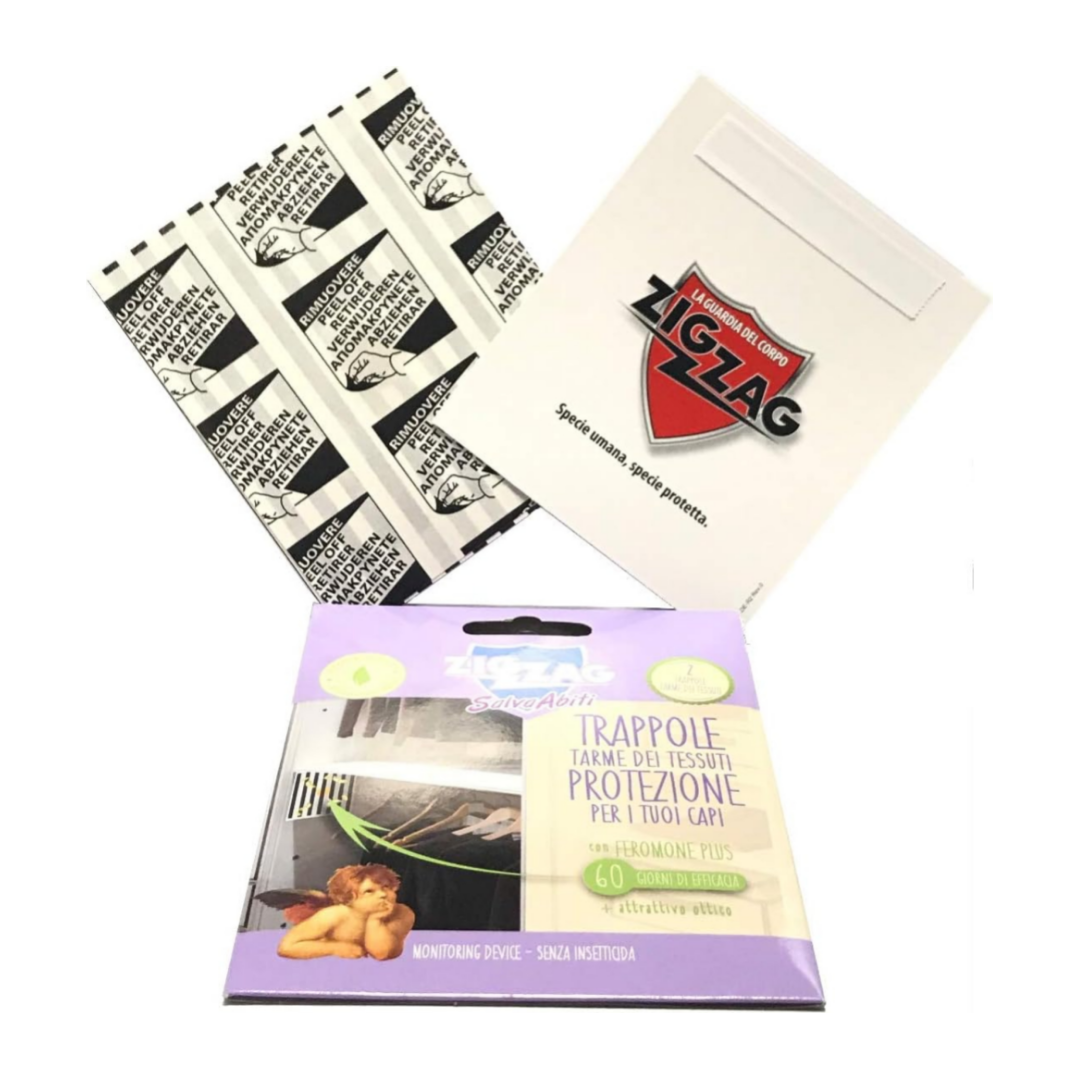 La trappola Zig Zag Il SalvaAbiti utilizza un sistema a feromoni specifici per attrarre e catturare le tarme dei tessuti, proteggendo i tuoi indumenti in modo pulito, sicuro e completamente naturale.
